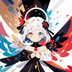 1girl,solo:1.5 BREAK white_angel with white further wing, light halo,white tone color, BREAK black_angel with black further wing,dark halo,black tone color, solo, (((((split theme))))), symmetry:1.3, upper body,cleavage, off shoulder,hair flower, off-shoulder dress, puffy long sleeves, puffy sleeves, rose petals, mandala,chaos,Radial, streamlined,fractal art,art design,burst,Heterochromatic pupil