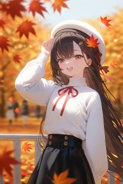 1girl, solo, skirt, long_hair, hat, maple_leaf, white_headwear, black_skirt, outdoors, long_sleeves, autumn_leaves, white_sweater, beret, bangs, smile, day, railing, red_ribbon, sweater, blurry, leaf, ribbon, very_long_hair, hair_between_eyes, depth_of_field, open_mouth, :d, hair_ornament, blurry_background, autumn, neck_ribbon, mole_under_eye, hand_up, puffy_long_sleeves, wind, puffy_sleeves, black_hair, brown_eyes, turtleneck