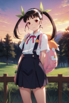 <lora:Hachikuji-000010:0.8>,Hachikuji cyql,1girl,looking at viewer,solo,black hair,long hair,twintails,hairband,ribbon,hair ribbon,green ribbon,red eyes,suspender skirt,backpack,bag,bandaid,bandaid on knee,school uniform,skirt,child,bracelet,Guilty, Downcast eyes, slumped shoulders, and a slightly ashamed expression.,panorama,beautiful face,beautiful eyes,glossy skin,shiny skin,Countryside, Cattle, Hills, Grass, Trees, Farmhouses, Fence, Sunset,(Bamboo shoots, Bamboo canopy, Misty atmosphere, Rustling leaves, Zen tranquility, Bamboo grove:0.6),beautiful detailed sky,beautiful detailed glow,posing in front of a colorful and dynamic background,masterpiece,best quality,beautiful and aesthetic,contrapposto,female focus,wallpaper,fashion,
