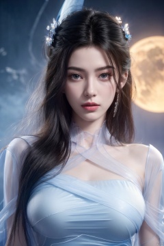 (8k, RAW photo, best quality, masterpiece:1.2), (super realistic, photo-realistic:1.3), ultra-detailed, extremely detailed cg 8k wallpaper, hatching (texture), skin gloss, light persona, (crystalstexture skin:1.2), (extremely delicate and beautiful), ultra-high resolution, (photo realistic: 1.4), Surrealism, Fantastical verisimilitude, beautiful blue-skinned goddess Phoenix Peacock on her head, fantastical creation, thriller color scheme, surrealism, abstract, psychedelic, 1 girl, flower,(translucent white gauze dress:1.3), (moon), moonlight, water surface, long hair, windy, qingyi, ll-hd, pf-hd, ty-hd, lmw-hd,Xlimuwan, Xmedusa,Yunxiao_Fairy,,(big breasts:1.39)