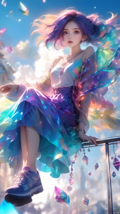 (masterpiece, best quali),1girl,blue sky,blurry background,Looking up,Shoes close to the camera,From below,full body,lips,long sleeves,looking at viewer,motion blur,outdoors,parted lips,railing,shoes,shorts,sitting,Crystal Girl, Colorful crystal decoration,Crystal necklace,Crystal on the body,Floating Colorful Crystal,Purple gradient hair,1girl, hand<lora:EMS-302898-EMS:0.600000>, <lora:EMS-303786-EMS:0.600000>, <lora:EMS-300702-EMS:0.600000>
