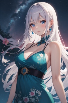 1girl,solo,(looking at viewer:1.1),Annoyed, Mouth turned down slightly, eyes narrowed, and a tense jaw.,Maxi dress with a tropical print,portrait,posing,beautiful face,beautiful eyes,glossy skin,shiny skin,BREAKPlankton, Bioluminescent, Bay, Night, Water, Glow, Serenity, Magic,(Rhododendron blooms, Alpine slopes, Himalayan peaks, Prayer flags, Mountain flora, Himalayan charm:0.6),beautiful detailed sky,beautiful detailed glow,posing in front of a colorful and dynamic background,masterpiece,best quality,beautiful and aesthetic,contrapposto,female focus,wallpaper,fashion,