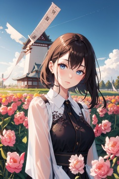 1girl,solo,(looking at viewer:1.1),Sleepy, Drooping eyelids, half-closed eyes, and a slightly dazed expression.,Modern and minimalist shirt dress with a pointed collar and belted waist,upper_body,posing,beautiful face,beautiful eyes,glossy skin,shiny skin,BREAKTulips, Fields, Colors, Spring, Windmill, Horizon, Serenity, Beauty,(Japanese maples, Tea house, Stone lanterns, Koi pond, Fall foliage, Tranquil retreat:0.6),beautiful detailed sky,beautiful detailed glow,posing in front of a colorful and dynamic background,masterpiece,best quality,beautiful and aesthetic,contrapposto,female focus,wallpaper,fashion,