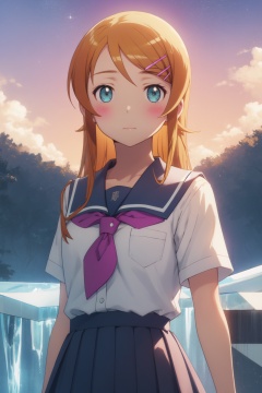 <lora:Kirino-000005:0.8>,Kirino cyql,1girl,looking at viewer,solo,long hair,orange hair,hairclip,hair ornament,aqua eyes,blush,school uniform,skirt,kousaka kirino's school uniform,Skeptical, Raised eyebrows and a slightly pursed mouth.,upper_body,beautiful face,beautiful eyes,glossy skin,shiny skin,Glacier, Peaks, Mountains, Ice, Blue, Crevasse, Serenity, Wilderness,(Cottage garden flowers, Herbaceous borders, Cottage charm, Summer blooms, English countryside, Bees buzzing:0.6),beautiful detailed sky,beautiful detailed glow,posing in front of a colorful and dynamic background,masterpiece,best quality,beautiful and aesthetic,contrapposto,female focus,wallpaper,fashion,