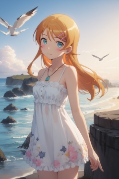 <lora:Kirino-000005:0.8>,Kirino cyql,1girl,looking at viewer,solo,long hair,orange hair,hairclip,hair ornament,aqua eyes,blush,necklace,jewelry,Floral embroidered sundress with a sweetheart neckline,Angry, tightened jaw, squinted eyes, and raised eyebrows.,cowboy_shot,beautiful face,beautiful eyes,glossy skin,shiny skin,Coastline, Rocks, Sea stacks, Waves, Seagulls, Cliffs, Tide pools, Coastal erosion,(Cherry blossoms, Garden path, Dawn light, Sakura petals, Tranquil setting, Japanese elegance:0.6),beautiful detailed sky,beautiful detailed glow,posing in front of a colorful and dynamic background,masterpiece,best quality,beautiful and aesthetic,contrapposto,female focus,wallpaper,fashion,