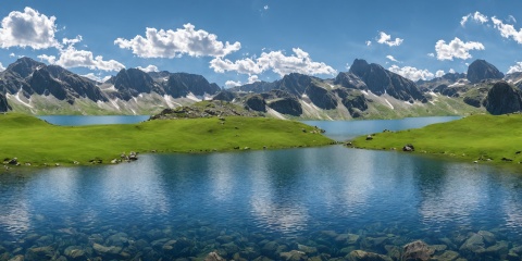 <lora:HMSG风景XL-000008:1>,Centered Horizon,No seams,A serene lake nestled among rocks and grassland,with a majestic mountain range serving as its backdrop. The clear waters of the lake mirror the sky above,creating a peaceful equilibrium between earth and heaven. The grass whispers with the wind,and the surrounding rocks stand as silent witnesses to the timeless beauty of this secluded haven.,<lora:光影XL:1>,