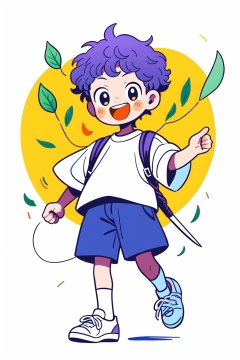 <lora:pencil style-7:0.8>,Guchen,pencil style,a boy,smiling,kite,open mouth,simple background,carrying a weapon,long sword,shoes,white background,socks,black eyes,full body,long sleeves,purple hair,trainers,white shoes and socks,white socks,short sleeves,yellow eyes,large leaves,white complexion,