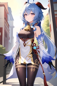 (masterpiece, best quality:1.2),insanely detailed,absurdres,ultra-highres,ultra-detailed,best quality,slender,kawaii,perfect symmetrical face,ultra cute girl,ultra cute face,ultra detailed eyes,ultra cute,ultra beautifu,<lora:ganyu_all-000001:1>,day,street,outdoors,ganyu \(frostdew trail\),ganyu \(genshin impact\),backless outfit,black bodysuit,long hair,black bodystocking,white elbow gloves,detached sleeves,gloves,black pantyhose,bare shoulders,breasts,white high heels,gold trim,chinese knot,tassel,1girl,solo,neck bell,standing,:o,
