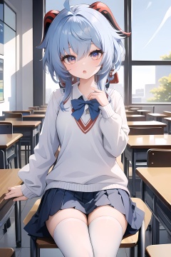 (masterpiece, best quality:1.2),insanely detailed,absurdres,ultra-highres,ultra-detailed,best quality,slender,kawaii,perfect symmetrical face,ultra cute girl,ultra cute face,ultra detailed eyes,ultra cute,ultra beautifu,<lora:ganyu_all-000001:0.8>,day,classroom,ganyu \(genshin impact\),1girl,solo,looking at viewer,school uniform,white thighhighs,:o,sitting,