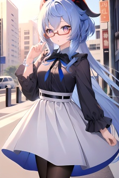 (masterpiece, best quality:1.2),insanely detailed,absurdres,ultra-highres,ultra-detailed,best quality,slender,kawaii,perfect symmetrical face,ultra cute girl,ultra cute face,ultra detailed eyes,ultra cute,ultra beautifu,<lora:ganyu_all-000001:1>,day,street,outdoors,ganyu \(china merchants bank\) \(genshin impact\),ganyu \(genshin impact\),1girl,solo,blue bow,frilled sleeves,bow,glasses,frills,long hair,shirt,red-framed eyewear,long skirt,long skirt,purple eyes,long skirt,long sleeves,bowtie,black pantyhose,:o,