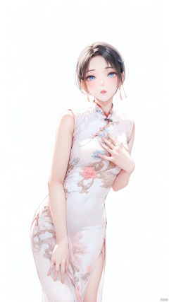 1girl, solo, short hair, black hair, white background, Blue eyes, white dress,Pink lips, chinese clothes, china dress, side slit, Medium breast,Cheongsam,——Clear hand contour,Hand intact,Five fingers of the hand are clear, loli, ((poakl))<lora:EMS-93-EMS:0.800000>, <lora:EMS-254762-EMS:0.500000>, <lora:EMS-260325-EMS:0.500000>
