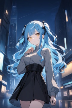 1girl, solo, long hair, breasts, looking at viewer, bangs, skirt, shirt, long sleeves, ribbon, medium breasts, closed mouth, blue hair, standing, hair ribbon, yellow eyes, sidelocks, cowboy shot, outdoors, sky, hand up, blunt bangs, black skirt, two side up, black ribbon, night, wavy hair, building, night sky, grey shirt, high-waist skirt, city, cityscape, skyscraper,cybersaki