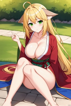 1girl, solo, long hair, breasts, looking at viewer, blush, bangs, blonde hair, large breasts, animal ears, cleavage, sitting, closed mouth, green eyes, collarbone, ahoge, thighs, outdoors, japanese clothes, barefoot, day, hand up, wide sleeves, kimono, blurry, legs, sash, bare legs, no panties, obi, antenna hair, TSSTSHH