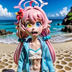 claymation-style,solo, red flower, 1girl, hoshino (blue archive), flower, blue jacket, hoshino (swimsuit) (blue archive), hair ornament, white bikini, frilled bikini, heterochromia, swimsuit, twintails, long hair, ahoge, yellow eyes, bikini, navel, halo, blush, looking at viewer, jacket, frills, low twintails, blue eyes, open mouth, pink hair, collarbone, hair between eyes, hair bobbles, outdoors, long sleeves, hair flower, official alternate costume, hibiscus, open clothes, blurry