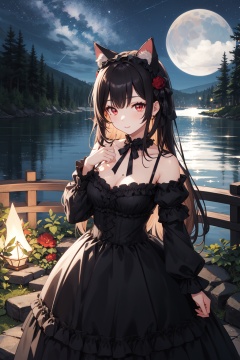 <lora:Ruri-0000010:0.8>,Ruri cyql,1girl,looking at viewer,solo,long hair,black hair,hime cut,red eyes,mole,mole under eye,cat ears,animal ears,gothic lolita,lolita fashion,dress,frills,Happy, wide smile with raised cheeks and crow's feet around the eyes.,full_shot,beautiful face,beautiful eyes,glossy skin,shiny skin,Lake, Moonlight, Reflection, Stars, Trees, Tranquility, Night sounds, Campfire,(Alpine flowers, Mountain peaks, Alpine meadow, Summer blooms, Alpine landscape, Mountain breeze:0.6),beautiful detailed sky,beautiful detailed glow,posing in front of a colorful and dynamic background,masterpiece,best quality,beautiful and aesthetic,contrapposto,female focus,wallpaper,fashion,