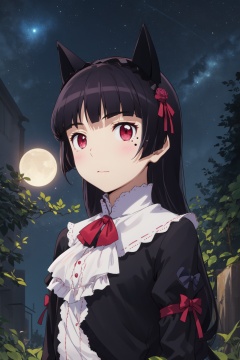 <lora:Ruri-000010:0.8>,Ruri cyql,1girl,looking at viewer,solo,long hair,black hair,hime cut,red eyes,mole,mole under eye,cat ears,animal ears,gothic lolita,lolita fashion,dress,frills,Sensual, A deep, intense gaze, a slow, deliberate smile, and a relaxed posture.,portrait,beautiful face,beautiful eyes,glossy skin,shiny skin,Landscape, Lunar, Moon, Craters, Rocks, Silence, Serenity, Mystery,(Enchanted trees, Fireflies, Glowworms, Magic atmosphere, Twilight hues, Whispers of the forest:0.6),beautiful detailed sky,beautiful detailed glow,posing in front of a colorful and dynamic background,masterpiece,best quality,beautiful and aesthetic,contrapposto,female focus,wallpaper,fashion,