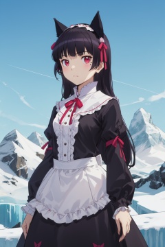 <lora:Ruri-000010:0.8>,Ruri cyql,1girl,looking at viewer,solo,long hair,black hair,hime cut,red eyes,mole,mole under eye,cat ears,animal ears,gothic lolita,lolita fashion,dress,frills,Pensive, Eyes focused inward, brow furrowed, and lips pursed.,cowboy_shot,beautiful face,beautiful eyes,glossy skin,shiny skin,Glacier, Peaks, Mountains, Ice, Blue, Crevasse, Serenity, Wilderness,(Agave plants, Succulents, Desert landscape, Cacti, Warm desert sun, Arid climate:0.6),beautiful detailed sky,beautiful detailed glow,posing in front of a colorful and dynamic background,masterpiece,best quality,beautiful and aesthetic,contrapposto,female focus,wallpaper,fashion,