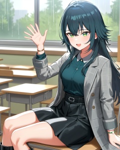 (impasto),best quality,masterpiece,highres,<lora:gakuenidolmaster1-A3:0.6>,temari tsukimura,temari one,1girl,long hair,green eyes,black footwear,black hair,grey coat,boots,black skirt,shirt,open clothes,jewelry,long sleeves,bracelet,upper body,plaid,sitting,classroom,rainning,waving,smile,:d,