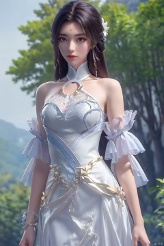 1 girl ,solo,yuechan ,bare shoulders,jewelry, long hair, black hair, updos, hair accessoriesdress,eyelashes,eyeshadow,(mole:1.2) ,Perfect female figure,full_body,