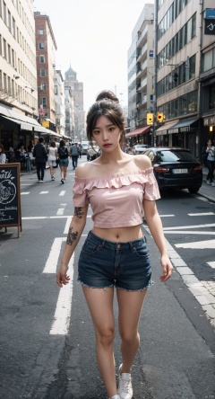 Logical, 18 years old girl,The golden ratio body,asian,White off-the-shoulder T-shirt,medium breasts,tattoo,city,perspective,high ponytail,1girl,xxs, Straighten your legs,Steps,Add details,full body photo ,outdoor,tattoos blackwork,moyou,walking, pink sneakers ,Hyperrealism,shorts,one hand touching head the other touching stomach