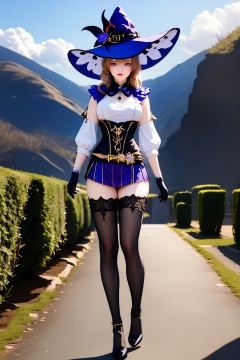 1girl, lisa \(genshin impact\), solo, thighhighs, witch hat, high heels, breasts, hat, outdoors, gloves, flower, black thighhighs, purple flower, vision \(genshin impact\), cleavage, hat belt, dress, rose, hat flower, black gloves, brown hair, looking at viewer, large breasts, purple rose, witch, parted lips, long hair, standing, full body, black footwear, purple headwear, standing on one leg, mountain, thighs, jewelry, sky,
