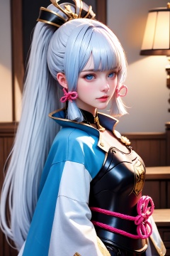 1girl, kamisato ayaka, solo, blue eyes, long hair, looking at viewer, ponytail, armor, blunt bangs, ribbon, hair ribbon, lips, white hair, tress ribbon, from side, breastplate, sidelocks, hair ornament, jacket, realistic, pink ribbon, upper body, nose, closed mouth, armored dress, blue jacket, japanese armor, long sleeves, blue hair, mole, mole under eye, blue capelet, high ponytail, looking to the side, arm guards, light blue hair, indoors