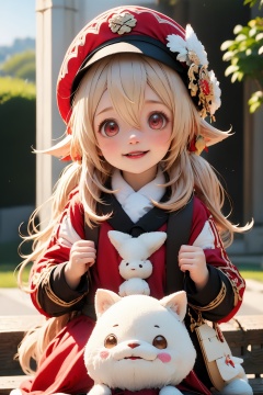 1girl, klee \(genshin impact\), pointy ears, hat, looking at viewer, red headwear, red eyes, ahoge, long hair, twintails, hair between eyes, smile, long sleeves, blurry, blonde hair, bag, solo, low twintails, sitting, blush, teeth, outdoors, depth of field, sidelocks, open mouth, cabbie hat, red dress, dodoco \(genshin impact\), dress, flower, :d, blurry background, light brown hair, dog, hat feather, child, belt, parted lips, coat, red coat, lips, bench, hat ornament, head tilt, day, clenched hands