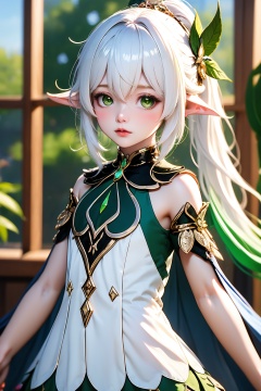 1girl, solo, nahida \(genshin impact\), pointy ears, green eyes, side ponytail, dress, looking at viewer, long hair, white dress, white hair, hair ornament, multicolored hair, blurry, hair between eyes, lips, sleeveless, bare shoulders, blurry background, symbol-shaped pupils, cross-shaped pupils, sleeveless dress, green cape, detached sleeves, gradient hair, gold trim, green hair, cape, parted lips, leaf hair ornament, window, sidelocks, indoors, breasts, blush, depth of field, short sleeves, small breasts, realistic, green sleeves, upper body, jewelry, closed mouth, green gemstone, cowboy shot, two-tone hair, gem