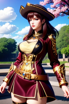 AgainAnimeLora2.8D, 1girl, solo, breasts, hat, outdoors, long hair, thighhighs, large breasts, brown hair, day, sky, skirt, blue eyes, blurry, belt, blue sky, lips, cherry blossoms, standing, cowboy shot, closed mouth, black skirt, tree, black thighhighs, red jacket, jewelry, blurry background, red lips, vambraces, makeup, dress, thighs, cloud, long sleeves, bracer, armor, gold trim, pirate hat, jacket, looking at viewer, depth of field, miniskirt, realistic, earrings, grey eyes,
