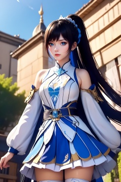 1girl, solo, ponytail, black hair, blue sky, blue eyes, building, thighhighs, sky, dress, long hair, hair ornament, looking at viewer, blurry background, clothing cutout, skirt, white dress, white thighhighs, outdoors, blurry, long sleeves, upper body, bare shoulders, blue dress