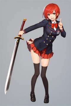 1girl,solo,thighhighs,skirt,weapon,sword,simple background,zettai ryouiki,full body,shoes,holding,looking at viewer,short hair,open mouth,school uniform,pleated skirt,holding weapon,black thighhighs,white background,holding sword,smile,jacket,bow,brown eyes,medium breasts,standing,long sleeves,buttons,bangs,pointing,red hair,blazer,bowtie,pointing at viewer,breasts,miniskirt,shiny,black footwear,score_8_up,score_9,<lora:TONY_XL_PONY:0.9>,