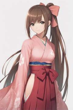 1girl, japanese clothes, solo, long hair, ponytail, brown hair, kimono, skirt, simple background, smile, hakama, bow, hakama skirt, looking at viewer, hair bow, wide sleeves, ribbon, white background, bangs, pink kimono, floral print, long sleeves, very long hair, medium breasts,score_8_up,score_9,<lora:TONY_XL_PONY:1>,