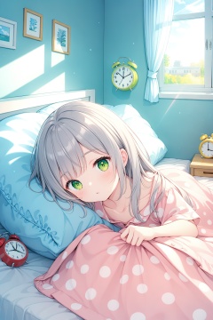 (masterpiece),(best quality),illustration,ultra detailed,hdr,Depth of field,(colorful),loli,1girl,clock,solo,alarm clock,under covers,green eyes,bed,long hair,pillow,indoors,sunlight,curtains,pajamas,grey hair,blanket,window,collarbone,bangs.,