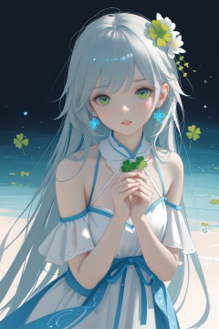 masterpiece,best quality,high quality,(colorful),[Artist sk (askzy)],[Artist wlop],Artist SHC,1girl,Luo Tianyi (Vocaloid),clover,solo,long hair,green eyes,four-leaf clover,dress,flower,own hands together,looking at viewer,water,hair ornament,parted lips,very long hair,bangs,earrings,white background,jewelry,bare shoulders,upper body,white dress,hair flower,ribbon,simple background,hands up,blush,