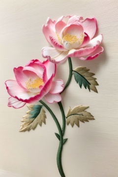((HRD, HUD, 8K)),((masterpiece, best quality)), highly detailed,Embroidery, no humans, still life, flower, blurry, signature, pink flower, depth of field, leaf, blurry background, realistic, <lora:20240520-1716211516835:0.9>