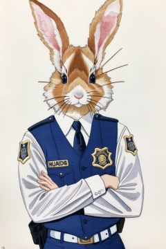 ((HRD, HUD, 8K)),((masterpiece, best quality)), highly detailed,Embroidery, crossed arms, purple eyes, solo, traditional media, looking at viewer, vest, shirt, furry, rabbit, long sleeves, upper body, uniform, rabbit ears, police, blue vest, animal, smile, animal ears, police uniform, animal focus, white shirt, closed mouth, <lora:20240520-1716211516835:0.8>