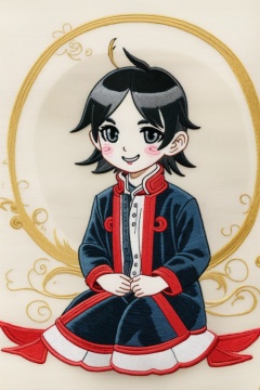 ((HRD, HUD, 8K)),((masterpiece, best quality)), highly detailed,Embroidery, 1boy,  chibi, traditional media, smile, sitting, looking at viewer,  <lora:20240520-1716211516835:0.9>