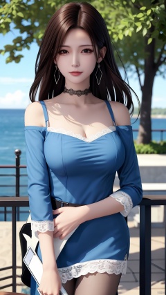 masterpiece, best quality, 8K, ultra high res, HZMiHua, Mature woman, solo,up body, seaside, long hair, pantyhose, Blue dress, belt, lace, earrings, collarbone, (mole under mouth: 1.3), (gun:1.1)