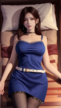 masterpiece, best quality, 8K, ultra high res, HZMiHua, Mature woman, solo,up body, seaside, long hair, pantyhose, Blue dress, belt, lace, earrings, collarbone, (mole under mouth: 1.3), (lying:1.1)