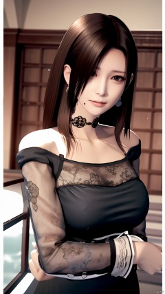 masterpiece, best quality, 8K, ultra high res, HZMiHua, Mature woman, solo,up body, seaside, belt, lace, earrings, collarbone, (mole under mouth: 1.3), hair over one eye, long sleeves, black dress