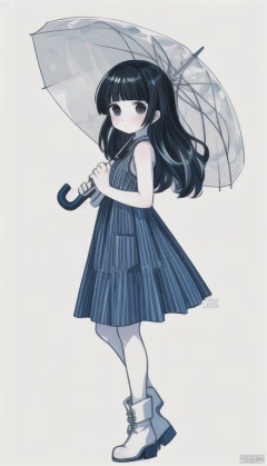 1girl, solo, long hair, looking at viewer, blush, bangs, simple background, white background, dress, holding, bare shoulders, closed mouth, standing, full body, grey hair, sleeveless, striped, shiny, artist name, signature, blunt bangs, white dress, black eyes, shiny hair, from side, looking to the side, hands up, bare arms, sleeveless dress, blue dress, umbrella, watermark, expressionless, blush stickers, white footwear, straight hair, vertical stripes, tareme, holding umbrella, long dress, dot nose, no nose, ankle boots, hair behind ear, pleated dress, transparent, striped dress, vertical-striped dress, transparent umbrella, pale color, white umbrella<lora:EMS-374381-EMS:0.500000>, <lora:EMS-378618-EMS:0.000000>, <lora:EMS-379493-EMS:0.800000>