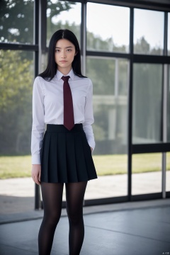 1girl,black_ dot_ pantyhose,black_hair,school uniform,standing,Contre jour\(photo\),