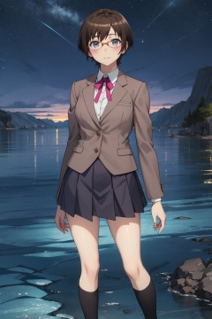 <lora:Manami-000015:0.8>,Manami cyql,1girl,looking at viewer,solo,short hair,brown hair,blue eyes,blush,glasses,semi-rimless eyewear,school uniform,blazer,skirt,socks,tearing_up,cowboy_shot,beautiful face,beautiful eyes,glossy skin,shiny skin,Plankton, Bioluminescent, Bay, Night, Water, Glow, Serenity, Magic,(Rose bushes, Spring blooms, Garden sanctuary, Fragrant air, English countryside, Springtime charm:0.5),beautiful detailed sky,beautiful detailed glow,posing in front of a colorful and dynamic background,masterpiece,best quality,beautiful and aesthetic,contrapposto,female focus,wallpaper,fashion,
