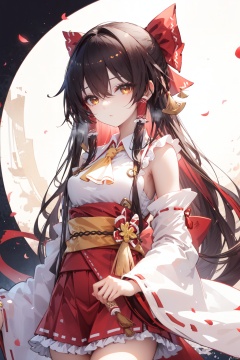 1girl, solo, hakurei reimu, bow, ofuda, gohei, red bow, skirt, hair bow, hair tubes, red skirt, ascot, wide sleeves, detached sleeves, ribbon trim, black background, yellow ascot, frills, brown hair, holding, long hair, ribbon-trimmed sleeves, looking at viewer, closed mouth, simple background, brown eyes, bare shoulders, red vest, frilled bow, vest, hair between eyes, bangs, sidelocks, nontraditional miko, sarashi, shirt, frilled skirt, cowboy shot