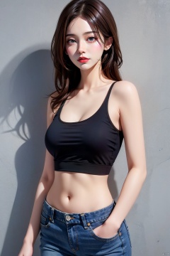 1girl, solo, breasts, looking at viewer, smile, brown hair, black hair, navel, bare shoulders, brown eyes, jewelry, closed mouth, standing, collarbone, cowboy shot, midriff, pants, lips, shadow, **** top, denim, jeans, realistic, arms at sides