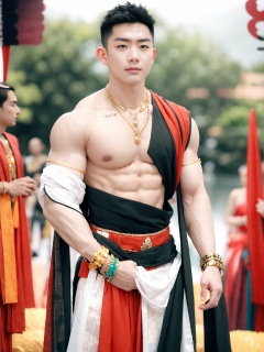 1boy,male focus,solo,jewelry,blurry background,blurry,bracelet,pectorals,cosplay,nipples,short hair,black hair,necklace,very short hair,muscular male,standing,gem,black eyes,