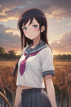 <lora:Ayase-000015:0.8>,Ayase cyql,1girl,looking at viewer,solo,long hair,black hair,blue eyes,blush,school uniform,kousaka kirino's school uniform,serafuku,skirt,pleated skirt,grey skirt,crazy_smile,full_shot,beautiful face,beautiful eyes,glossy skin,shiny skin,Wheat, Fields, Sunset, Colors, Horizon, Harvest, Serenity, Beauty,(Palm trees, White sand, Turquoise water, Hammocks, Tiki torches, Sunset hues:0.5),beautiful detailed sky,beautiful detailed glow,posing in front of a colorful and dynamic background,masterpiece,best quality,beautiful and aesthetic,contrapposto,female focus,wallpaper,fashion,