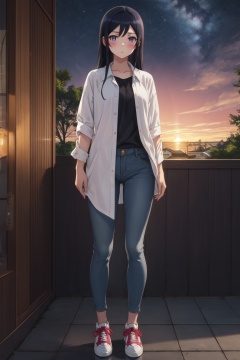 <lora:Ayase-000015:0.8>,Ayase cyql,1girl,looking at viewer,solo,long hair,black hair,blue eyes,blush,Straight leg jeans, oversized button-down shirt, and sneakers.,smile,upper_body,beautiful face,beautiful eyes,glossy skin,shiny skin,Coral, Fish, Seaweed, Sunlight, Clear water, Diverse marine life, Colorful, Serenity,(Cherry blossoms, Canal, Wooden bridges, Traditional architecture, Hanami season, Japanese tradition:0.5),beautiful detailed sky,beautiful detailed glow,posing in front of a colorful and dynamic background,masterpiece,best quality,beautiful and aesthetic,contrapposto,female focus,wallpaper,fashion,