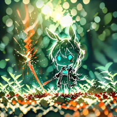 line art,chibi, (masterpiece,best quality),1girl, animal ears, amiya (arknights), solo, blue eyes, rabbit ears, long hair, holding, looking at viewer, blood, weapon, blue ascot, holding weapon, brown hair, ascot, hair between eyes, sword, holding sword, jacket, blood on face, closed mouth, open clothes, sidelocks, open jacket, jewelry, shirt, neck ring, white shirt, black jacket, ponytail, glowing,