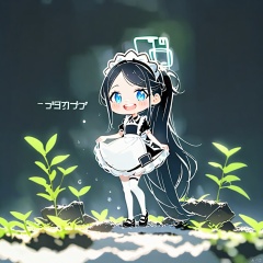 line art,chibi, (masterpiece),(best quality),masterpiece,best quality,very aesthetic,absurdres,newest, BREAK sdorica composition,black background,simple background,character name, BREAK 1girl, solo, aris \(blue archive\), aris \(maid\) \(blue archive\), halo, long hair, black hair, thighhighs, white thighhighs, apron, blue eyes, official alternate costume, maid headdress, maid, very long hair, full body, simple background, white background, short sleeves, open mouth, dress, looking at viewer, maid apron, white apron, black footwear, borrowed clothes, shoes, black dress, frilled apron, frills, blush, upper teeth only, ponytail, smile, puffy sleeves, standing, side ponytail, teeth, puffy short sleeves, absurdly long hair, garter straps, skirt hold, bow, sidelocks,